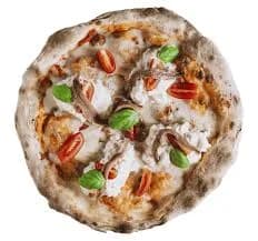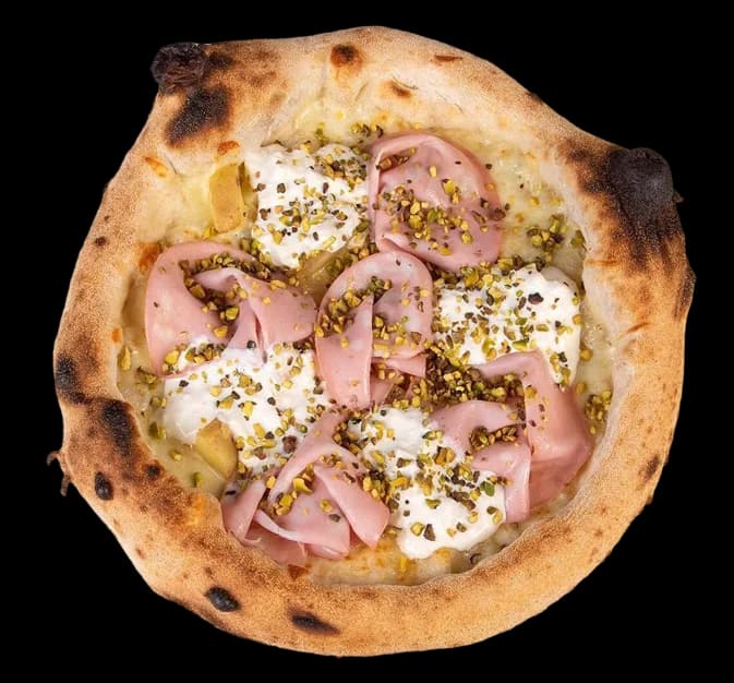 Salsa di pomodoro, provola, salame piccante, pesto di pistacchi, granella.